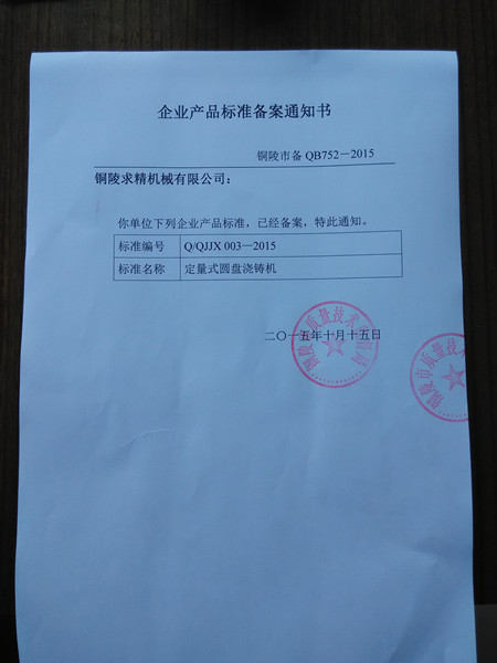 近期,由我公司編制的定量式圓盤(pán)澆鑄機(jī)企業(yè)標(biāo)準(zhǔn)通過(guò)由市質(zhì)監(jiān)局組織的專(zhuān)家審核,并批準(zhǔn)備案。標(biāo)志我公司制作定量式圓盤(pán)澆鑄機(jī)已進(jìn)入規(guī)范制作和驗(yàn)收的軌道。